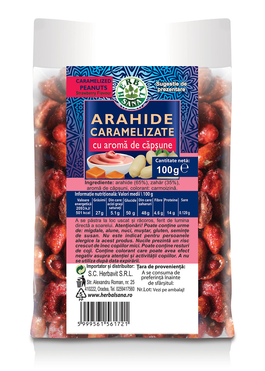 Ingrediente: arahide (65%), zahăr (35%), aromă de căpșuni, colorant: carmoizină