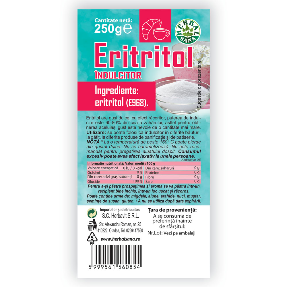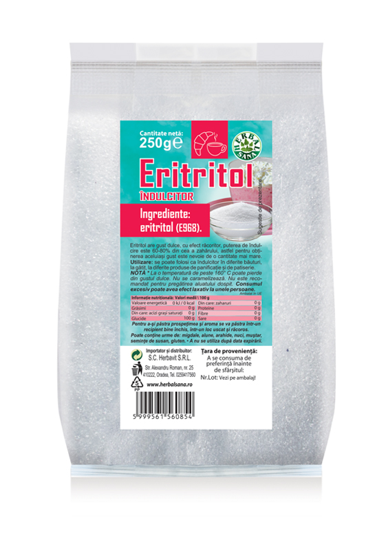 Eritritorul are gust dulce, cu efect răcoritor, puterea de îndulcire este de 60-80% din cea a zahărului, astfel pentru obținerea aceluiași gust este nevoie de o cantitate mai mare.