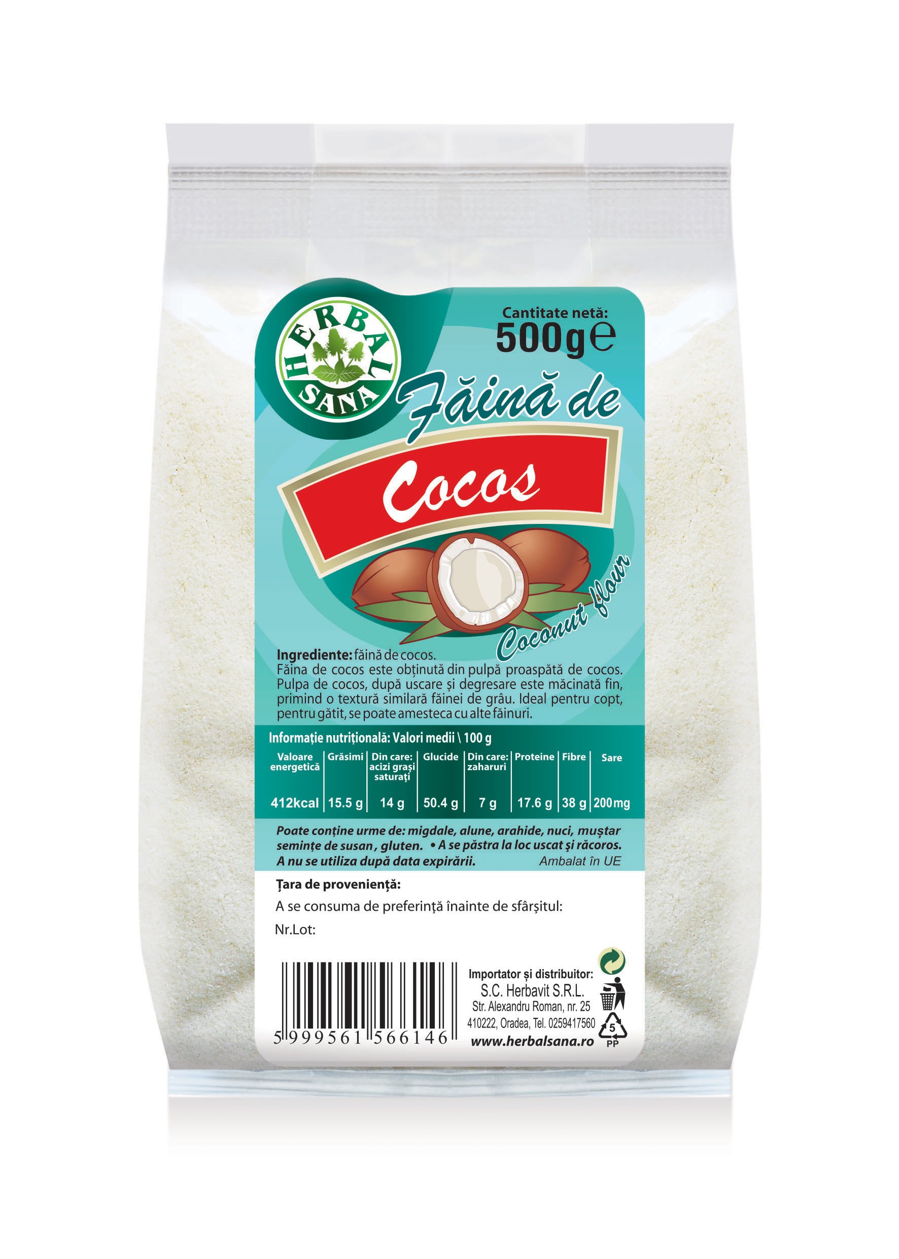 FĂINĂ DE COCOS Ingrediente: făină de cocos Făina de cocos este obţinut din pulpă proaspătă de cocos. Pulpa de cocos, după uscare şi degrasare este macinată fin, primind o textură similară făinei de grâu. Ideal pentru copt, pentru gătit, se poate amesteca cu alte făinuri.