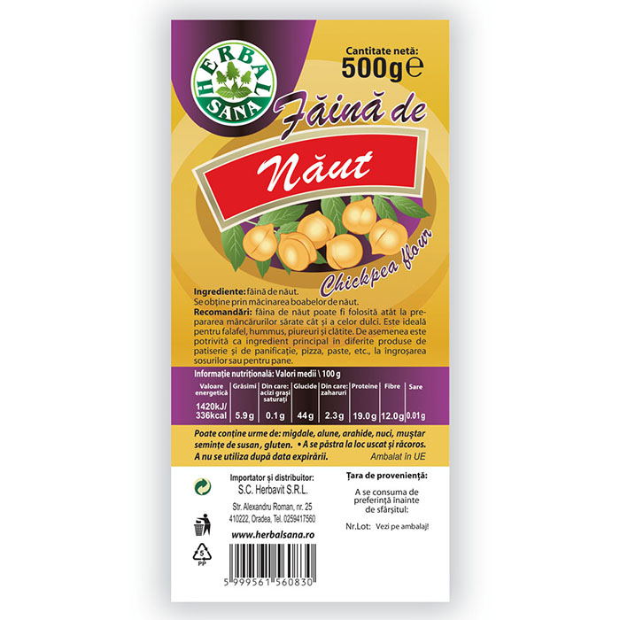 - Recomandări: Făina de năut poate fi folosită atât la prepararea mâncărurilor sărate cât și a celor dulci. Este ideală pentru falafel, hummus, pireuri și clătite. De asemenea este potrivită ca ingredient principal în diferite produse de patiserie și de panificație, pizza, paste etc., la îngroșarea sosurilor sau pentru pane.