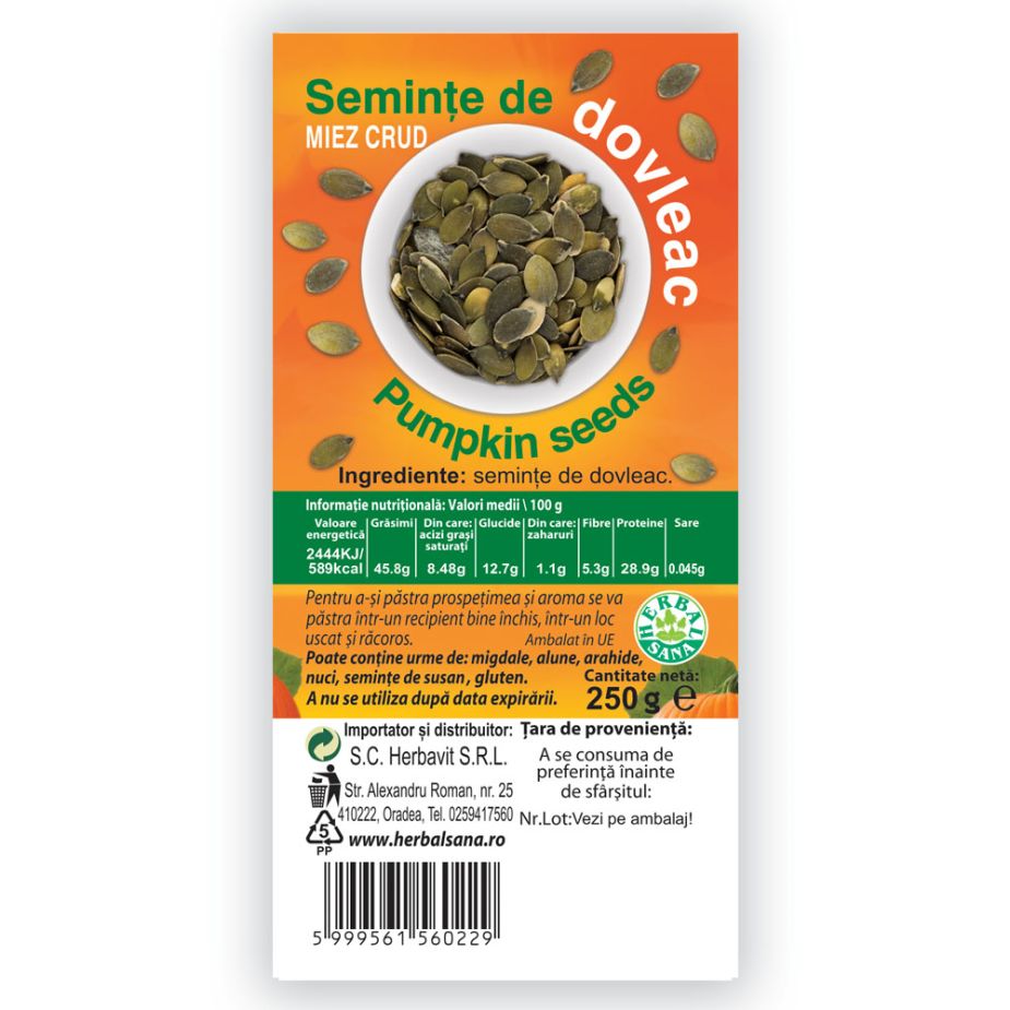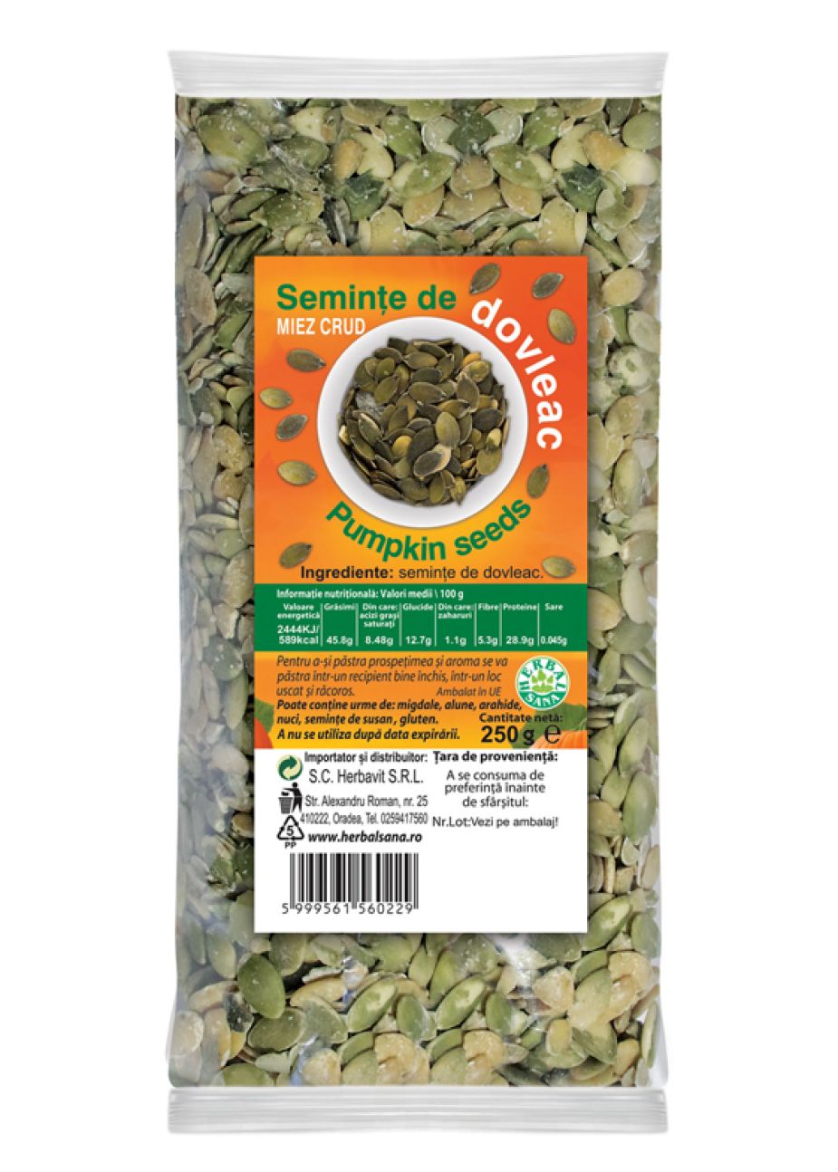 Cantitate neta:250g Ingrediente: miez crud de seminte de dovleac Cu un gust plăcut și cu un conținut bogat de vitamine, minerale, proteine și acizi grași semințele de dovleac sunt o importantă sursă de energie și sănătate pentru organism. Pentru prevenirea și tratarea problemelor de sănătate semințele de dovleac pot fi consumate fie în stare crudă fie sub formă de ulei. Datorită conținutului bogat în acizi grași Omega 3 sunt de mare ajutor pentru prevenirea bolilor de inimă. Pe lângă aceste beneficii semințele de dovleac reduc nivelul colesterolului rău și îmbunătățesc circulația sanguină. De asemenea prin conținutul bogat de potasiu aceste semințe normalizează tensiunea arterială. Pentru toate aceste beneficii ele sunt recomandate în consumul zilnic dar în cantități moderate. Informație nutrițională: Valori medii / 100 g Valoare energetica: 2444kJ/ 589kcal Grăsimi:45,8 g Din care acizi grași saturați : 8,48 g Glucide: 12,7 g Din care zaharuri : 11,3 g Fibre: 5,30 g Proteine: 28,9 g Sare: 0,05 g ●Poate conține urme de: alune, arahide, migdale, nuci, semințe de susan, gluten. Pentru a-şi păstra prospeţimea şi aroma se va păstra într-un recipient bine inchis, într-un loc uscat şi răcoros. A nu se utiliza după data expirării. Loc de provenienţă: ChinaSpecificații tehnice
